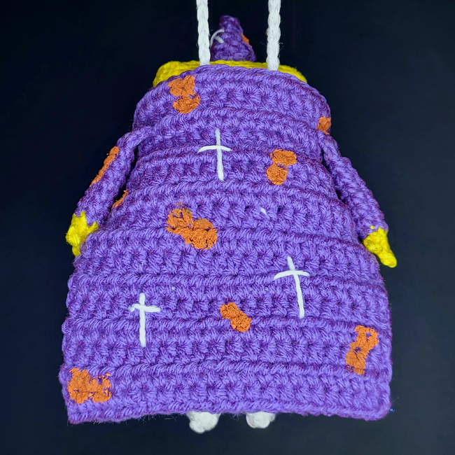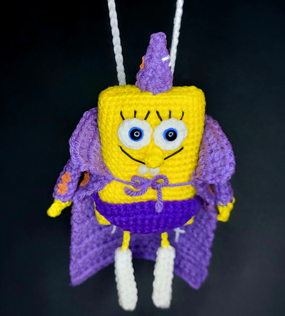 To make Goofy SquareGoob you will need: darning needle, scissors, 10mm safety eyes, black size 10 crochet thread, fiber fill, optional: paint markers to draw peanuts and sparkles on hat and cape, and spots onto sponge. Tools required: 3.5 mm.