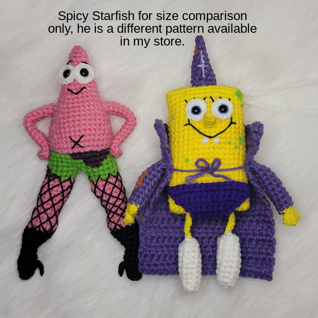 Splash into a world of giggles, bubbles, and wiggly wobbles with Goofy SquareGoob! This pattern will help you crochet your very own squishy, silly underwater pal perfect for causing mischief, making friends, or just floating around in pure crochet chaos. You'll need worsted weight yarn, a 3.5 mm hook, crochet thread, fiber fill, 10mm safety eyes, a darning needle, scissors, and, if you want to add some extra giggly details, optional acrylic paint pens. Your finished sponge will be roughly 9 inches tall.