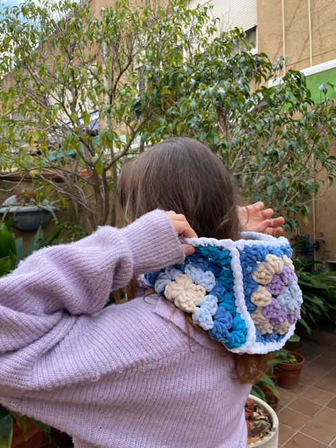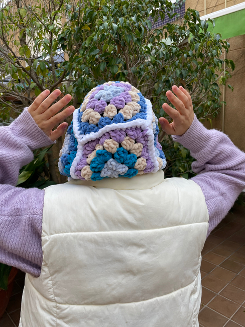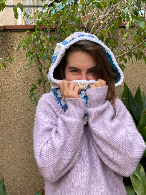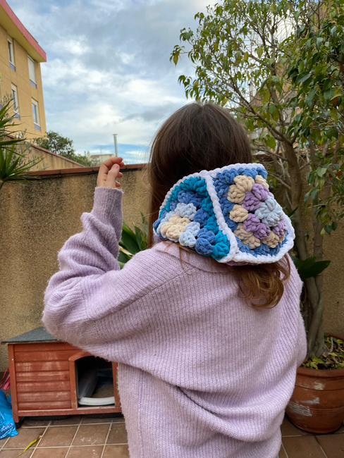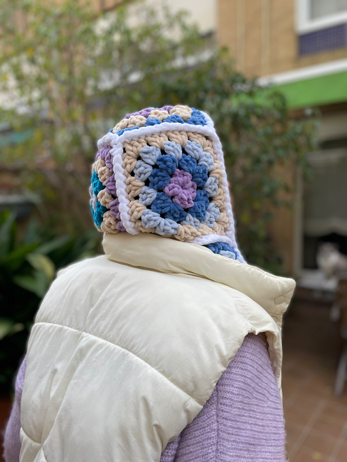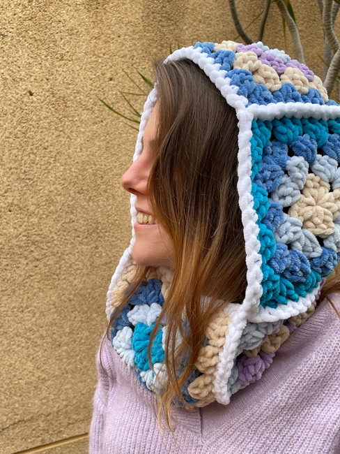 Patrón para una balaklava hecha a partir de granny squares Se recomienda material tipo Velvet, aunque también se puede usar algodón o acrílico, según la preferencia.