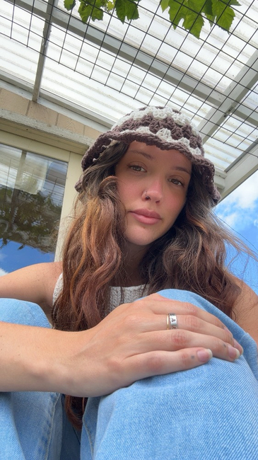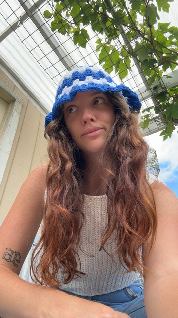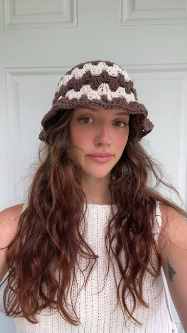 kopoi studios designed the Granny stitch bucket hat pattern. Find more of their patterns on their Ribblr shop page.