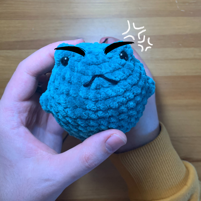 Picture this: a dour-faced frog with an adorably pouty expression and an ever so round booty, sitting amidst lily pads and water lilies in your favorite corner of the pond. This quirky amphibian captures the essence of a bad day, but with a touch of amigurumi cuteness, it transforms into a huggable work of art that radiates personality and charm. Not to mention it's cute bum could brighten anyone's day.
