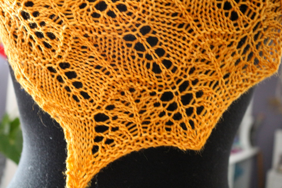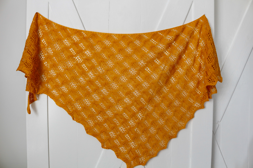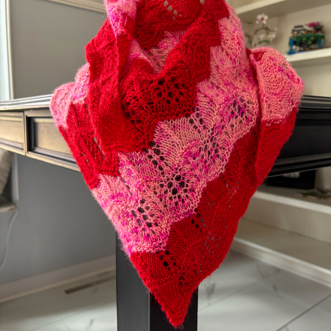 This triangular shawl is worked on the bias, beginning at one corner and gradually expanding as you knit. With three stitches added every four rows, it grows steadily, creating a beautifully flowing shape. The result is a lush, elegant accessory with effortless drape and movement.