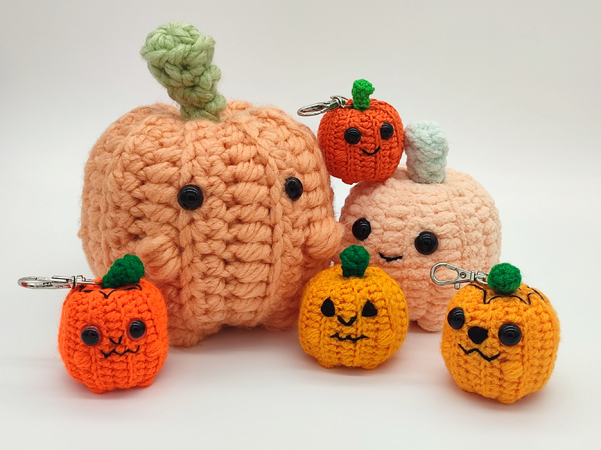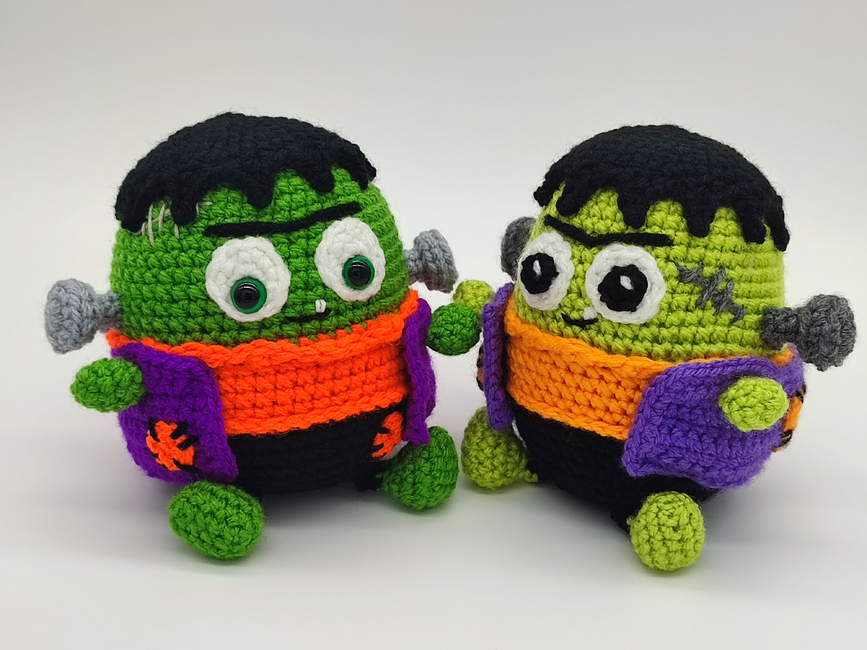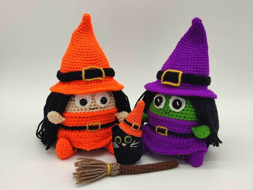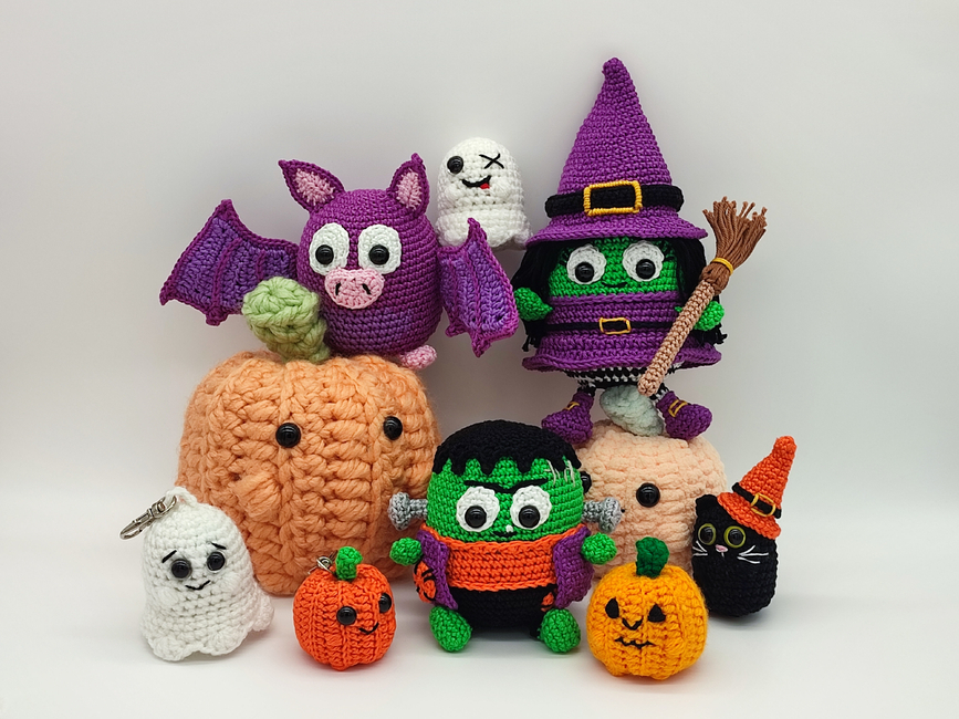 My 2024 bundle of Halloween Amigurumi crochet patterns features a Witch with her broomstick and black cat companion (the no-sew Mini Kitten pattern), along with Frankenstein's Monster and a cute Bat. The collection also includes two extra mini patterns: Eggy Ghost (no-sew) and Eggy Pumpkin. Perfect for Halloween crafting, these patterns are fun and easy to follow.