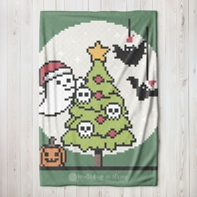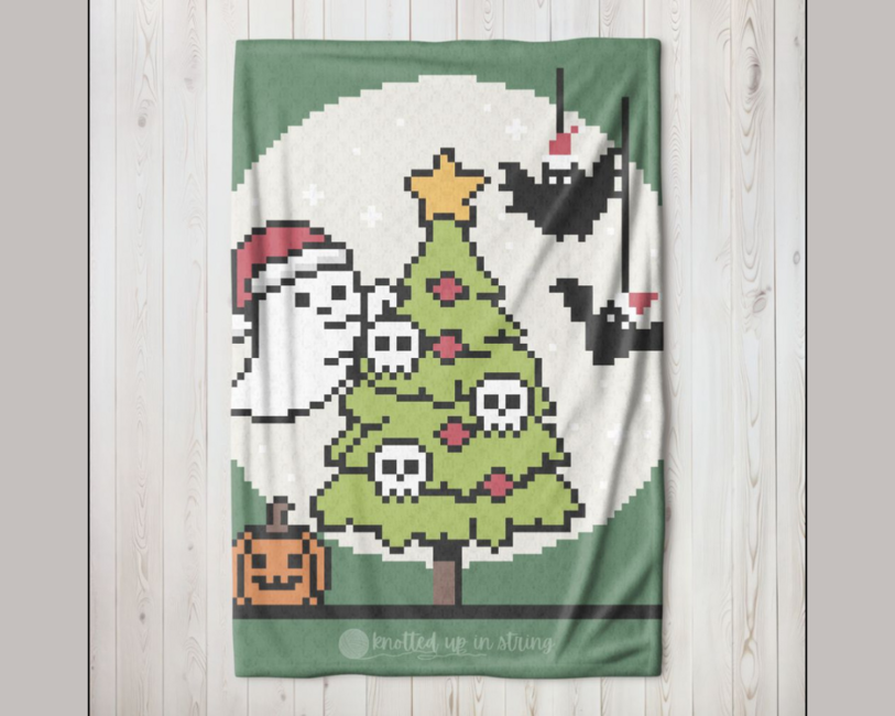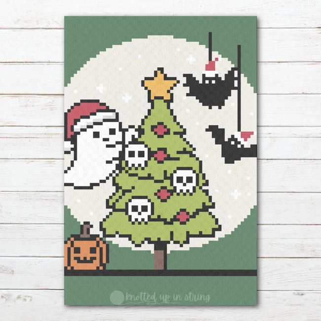 Embrace the best of both spooky and festive worlds with 'Hallow'mas,' a playful corner-to-corner (C2C) crochet blanket that combines the magic of Halloween and Christmas! This whimsical design features a festive ghost in a Santa hat, decorating a Christmas tree with skull ornaments, while bat decorations bedecked with Christmas spirit and a mischievous Jack O'Lantern looks on. With a sparkling full moon as the backdrop, this unique blanket is perfect for anyone who loves to celebrate both holidays in a fun, imaginative way.