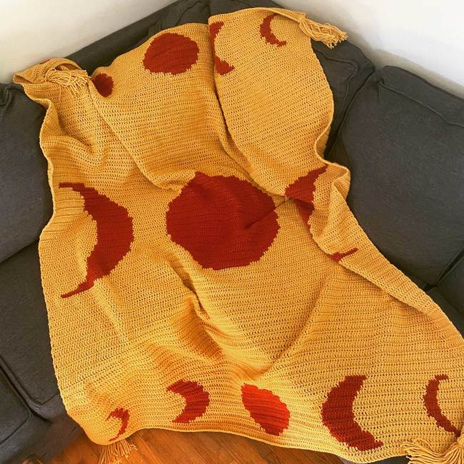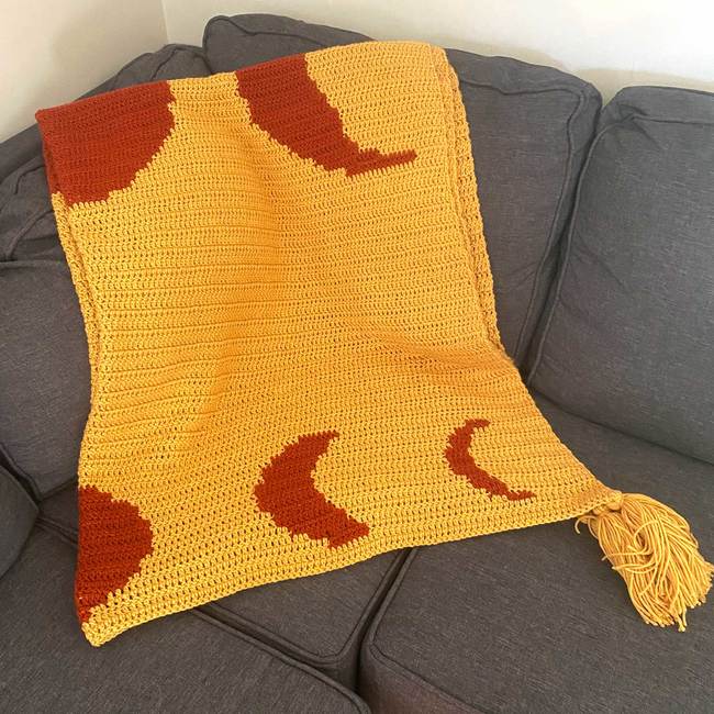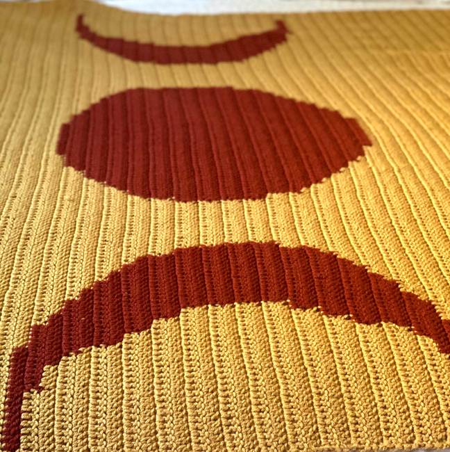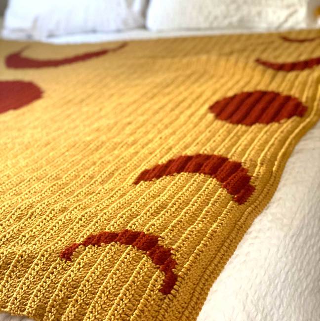 This Harvest Moon blanket is very easy to crochet as it’s only about 1 stitch (double crochet). What might be a little trickier is the counting stitches for every moon phase. Once you will find your way to change colors and carry them, it's super fun. No worries! There are some parts you won't have to count at all! I love huge blankets and this one will cover you all or for its