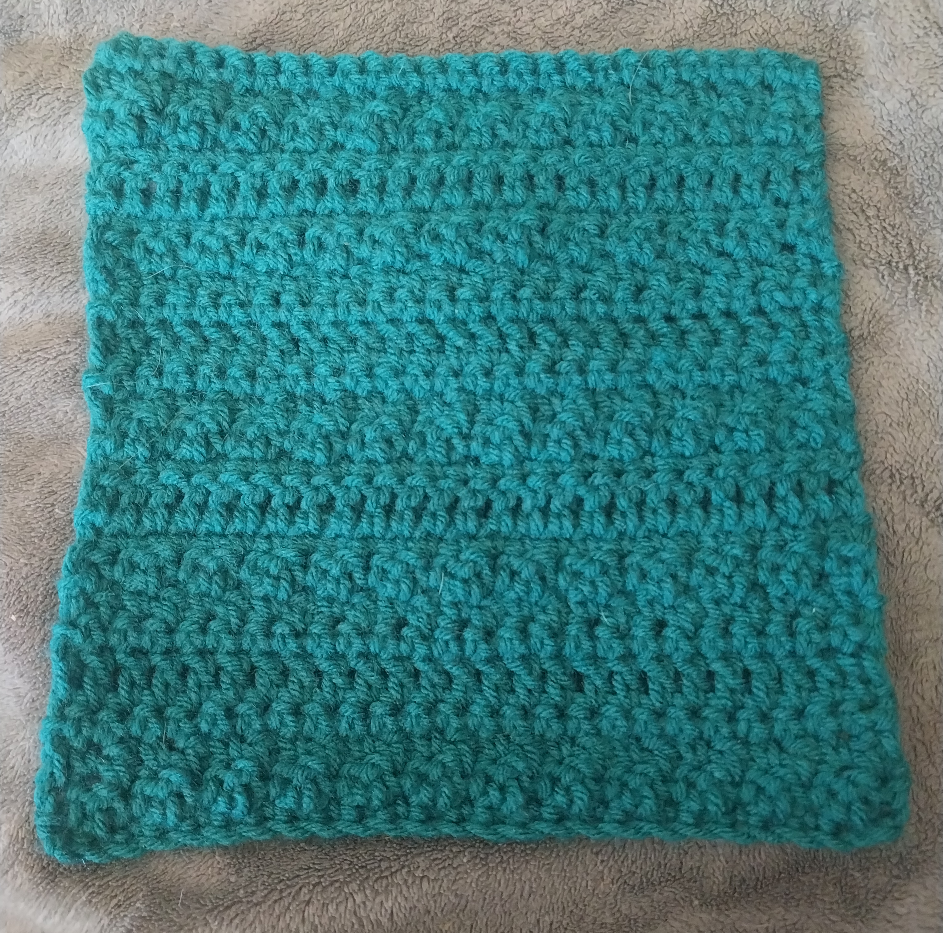 It also uses a stacked double crochet in place of the traditional chain 2 at the beginning of each double crochet row or start of each seed stitch rows.