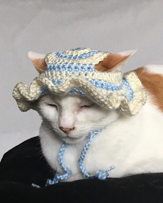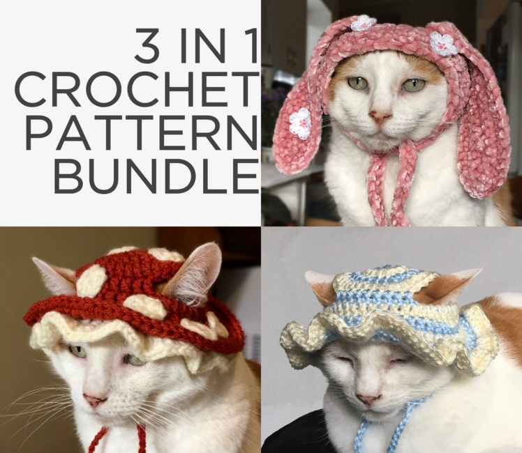 This crochet pattern bundle includes 3 cat hat patterns: The bucket hat, mushroom hat, and floral bunny hat for cats! Listed below is the info for each pattern.