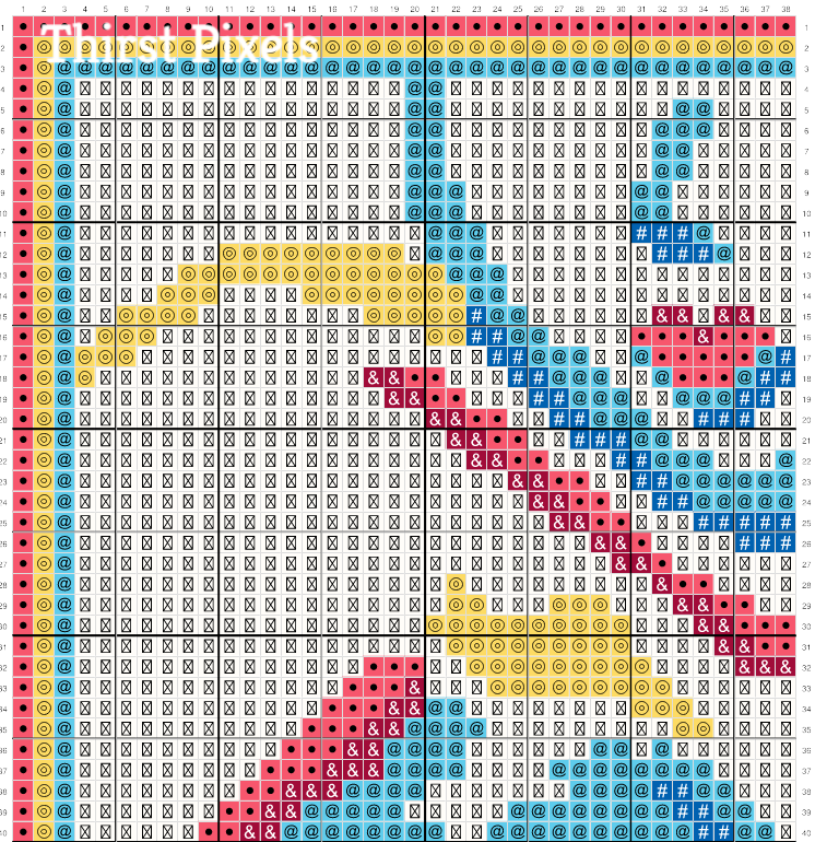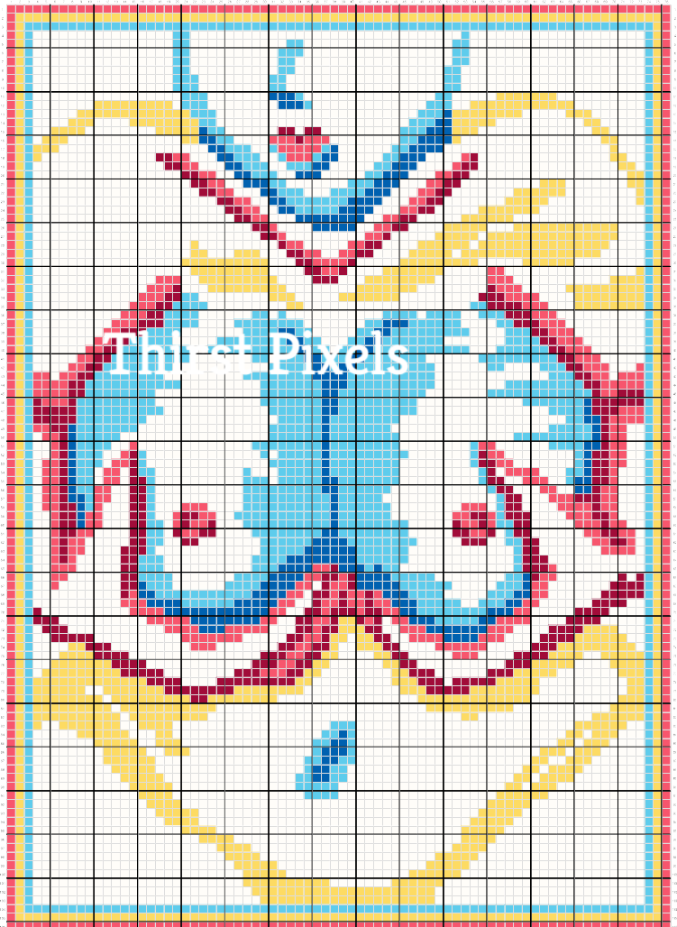 Why do I have so many Pan Pride themed charts? Well, this is my only design that ever got rejected by a human moderator on a certain nonogram website (my designs started as puzzles), so I gave them a sexy pan pride man chest, with strategically placed antlers, instead. Then I had to tweak the colors so he became TWO sexy man chests.