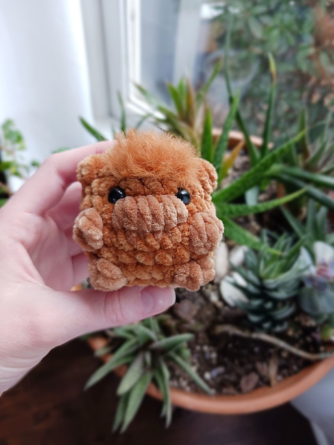 No sewing is required, although there are a number of color changes for the feet, nose, horns, and tail (optional). Overall, this pattern works up super quickly and makes an adorable plushie!!