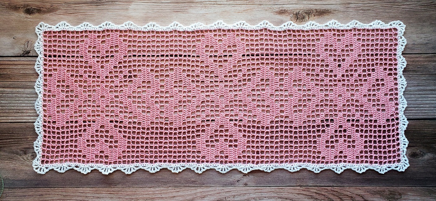 Table Runner is made in 2 steps: first the hearts in filet crochet technique following the chart, then adding the edge in 2 rounds using a contrast color thread.