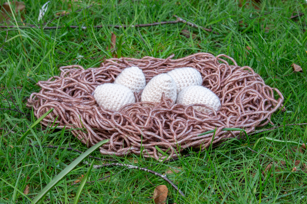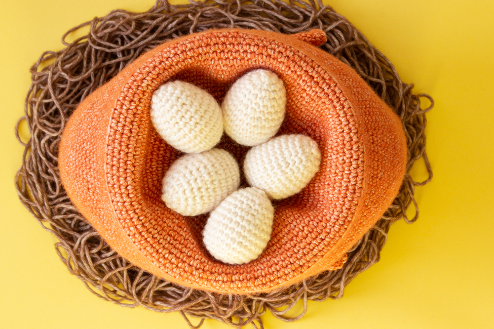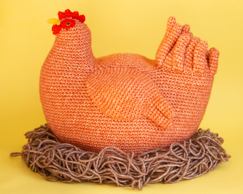 The chubby crochet chicken has a cavity underneath to hide her eggs in. It makes for a fun project for crocheters with some amigurumi experience, as well as seasoned amigurumi enthusiasts.