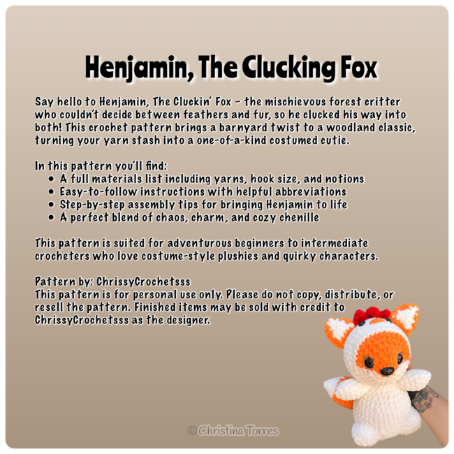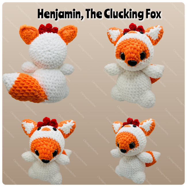 Meet Henjamin, the Cluckin' Fox your favorite feathered fox-friend with a flair for chaos and cuteness! This mischievous hybrid is part chicken, part fox, and 100% fabulous. With his fluffy wings, foxy tail, and signature red comb, Henjamin is here to cluck up your crochet lineup in the most adorable way possible.