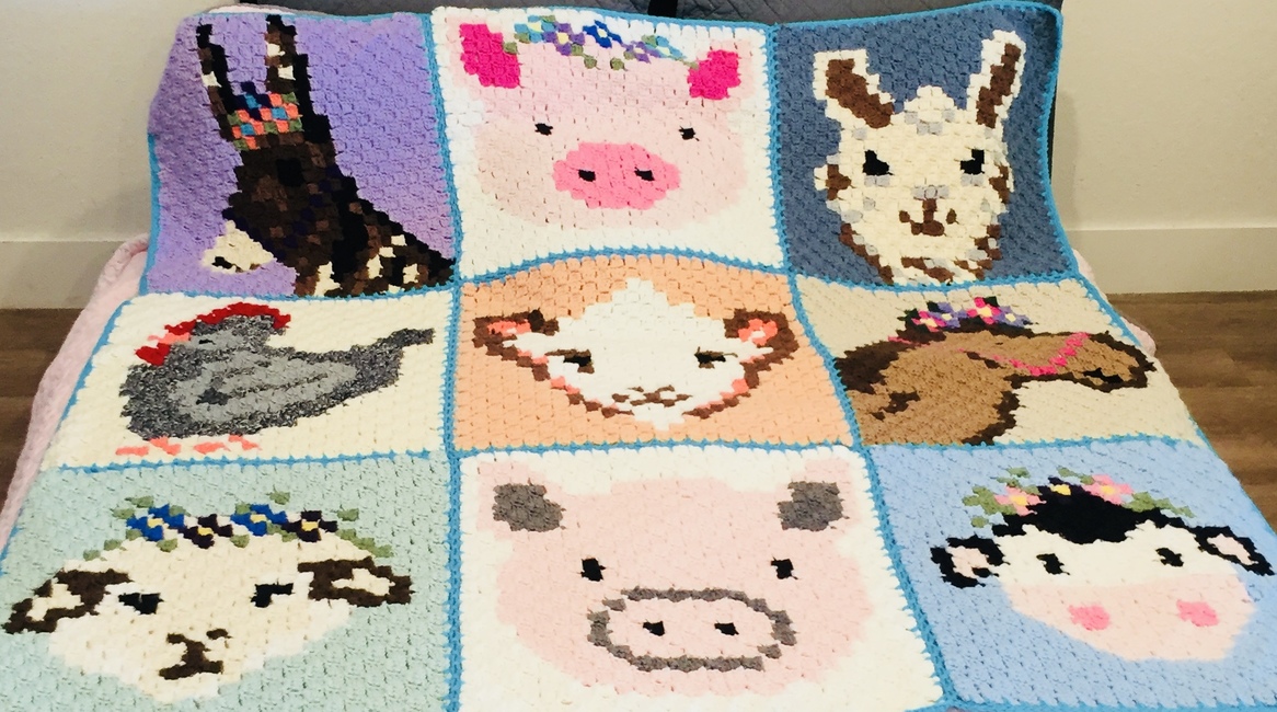 This C2C square can be used on its own to make a throw pillow, baby lovey, small pet blanket, wall hanging; or it can be mixed and matched with other square patterns I will be sharing with you so you join your farm animal squares together to make them into a blanket, throw or large wall hanging.