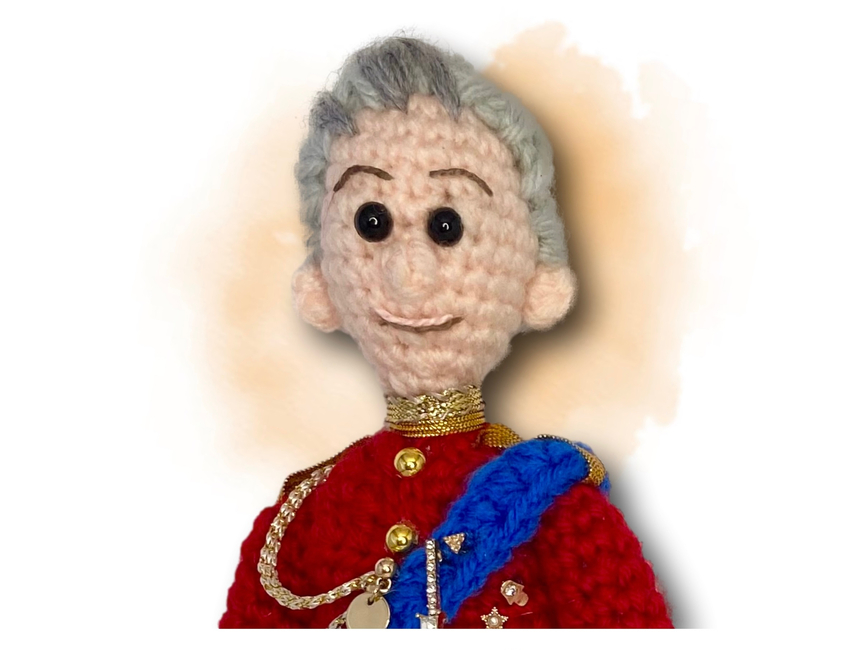 This tribute to King Charles III is made with light worsted or DK weight yarns with wired limbs. This pattern includes more than 30 colour photos to help you along the way.