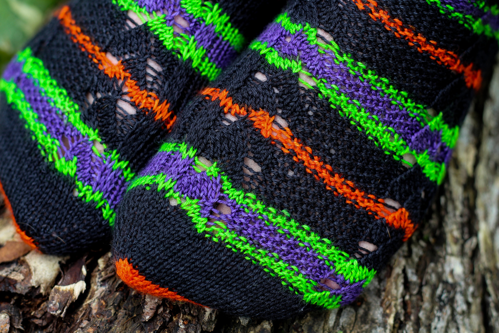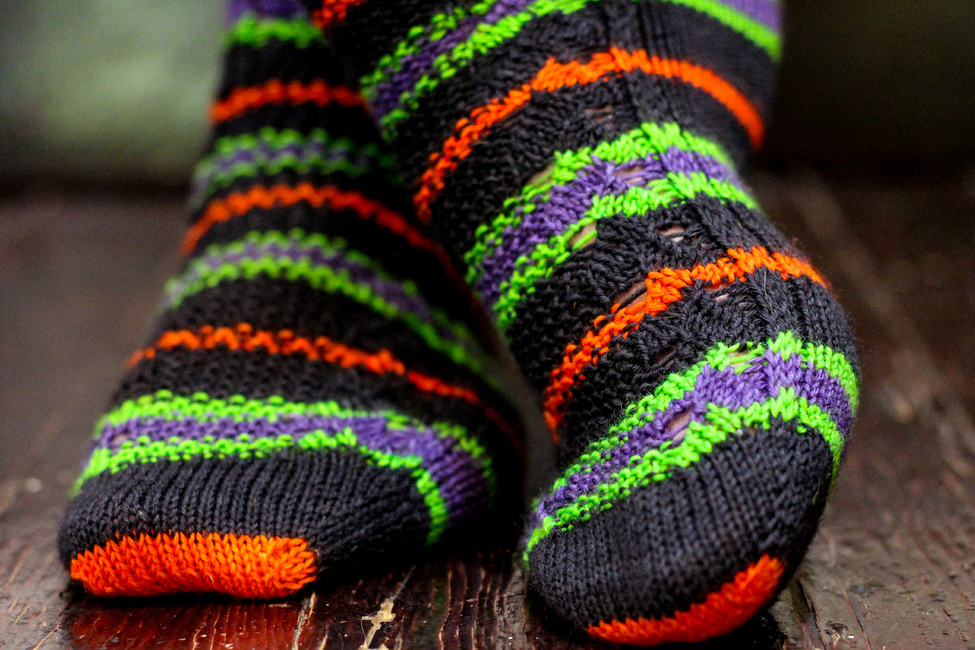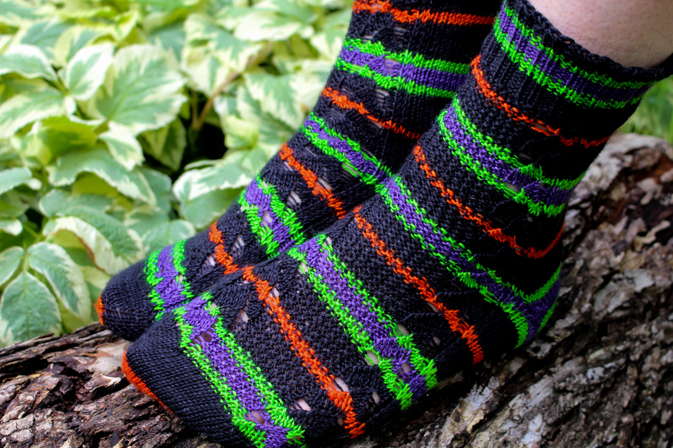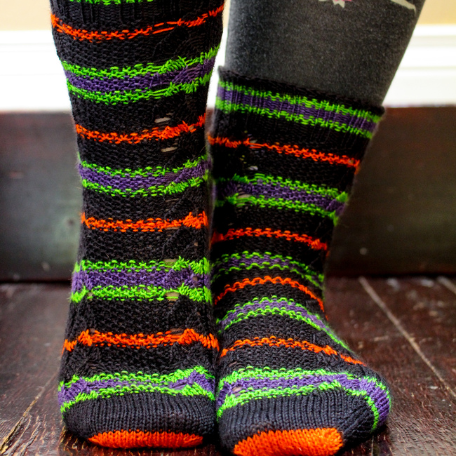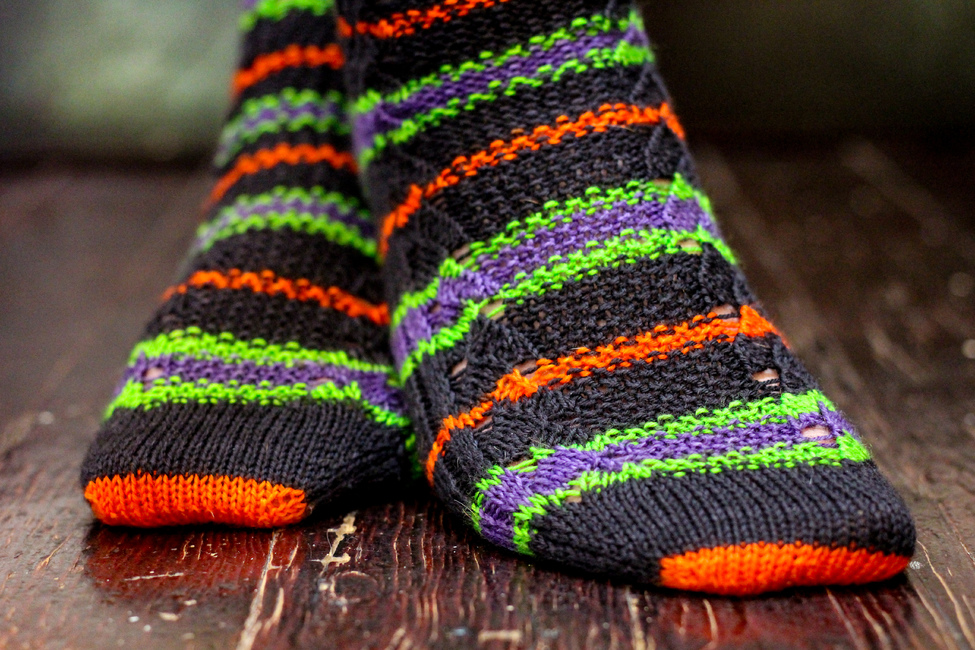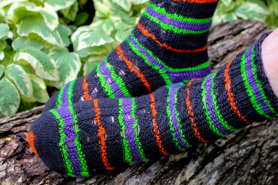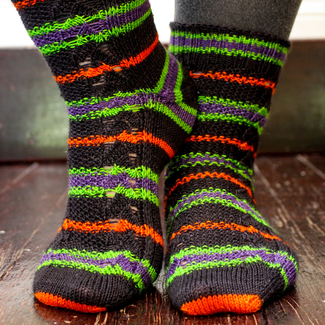 Worked in the round, Hocus Pocus contains both cuff-down and toe-up written directions and a chart for the pattern stitch. The pattern has instructions for an afterthought heel, but you may substitute whatever heel you enjoy using.