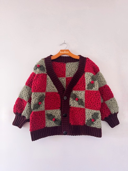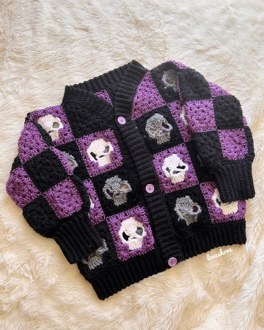 This bundle is a collection of my intermediate-level crochet granny square cardigan patterns. It includes the heart granny square cardigan for Valentine's, the memento mori skull granny square cardigan for Halloween, and the holly jolly granny square cardigan for Christmas. Create your dream holiday cardigan with these patterns. These patterns mainly use worsted weight yarns.