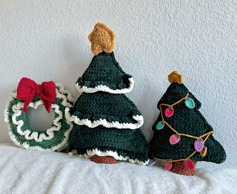 If you are looking for easy and medium to large sized plushies, these 3 holiday treats are great for you! This listing includes the ruffled tree, the mini holiday tree and the ruffled wreath patterns.