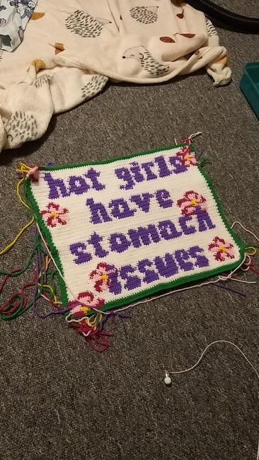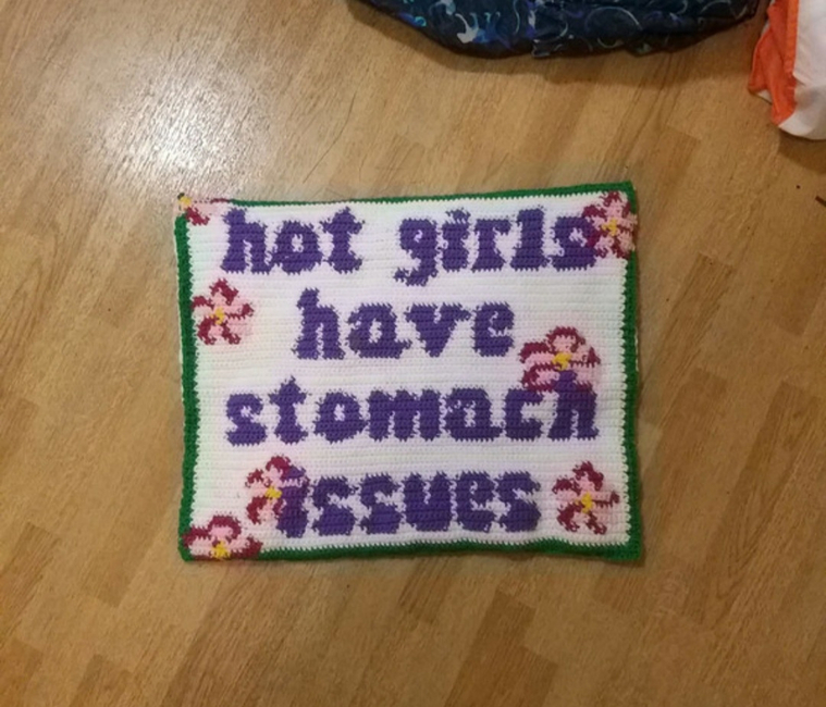 Crochet grid reading 'hot girls have stomach issues' with a border and floral details.
