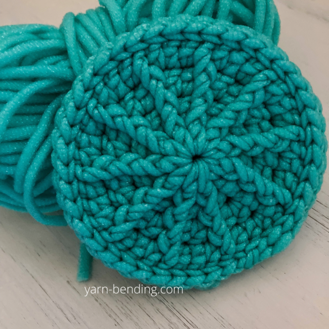 These scrubbies are made in two halves that are crocheted separately and then slip stitched together to form a thick and durable scrubby. The one side is smooth, while the other side has spoke like ridges emanating from the center, that made me think of wheels and hubcaps, hence the Hubcap Dish Scrubby! The ridges help provide additional scrubbing action.