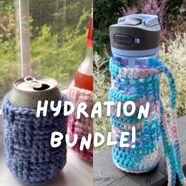 Stay hydrated during these upcoming warm months with two patterns both designed to fit different types of drinkware! Use the Breezy Bottle Bag to take any water bottle on the go with custom sizing to perfectly fit your favorite bottle. Then, use the Basket Can/Bottle Coozie to hold cans and glass bottles. Together, you'll keep your hands dry from condensation, protect your tables from water marks, and make staying hydrated super easy!