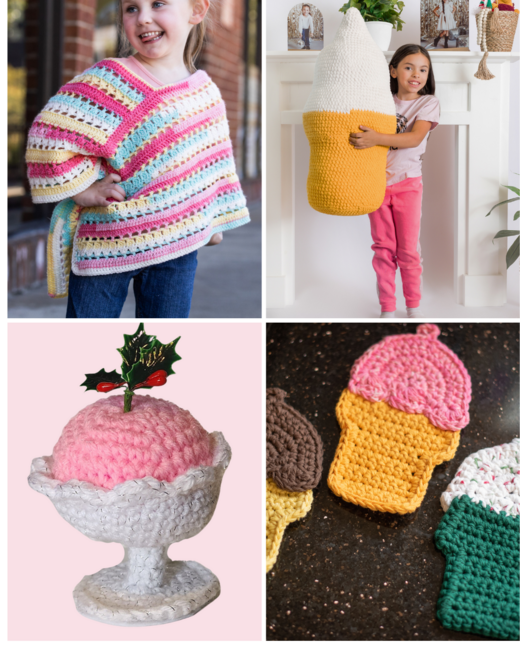 Everyone loves ice cream, and what better way to enjoy it all year than to crochet some ice cream cone potholders for your kitchen and a large ice cream cone pillow for your living room. There's also an adorable Tutti Frutti Girl's Poncho pattern for your little one. Potholder pattern works up quickly with a double strand of cotton yarn and measures approximately 5"x7". Make a few in your favorite "flavors." Christmas ornament adds a touch of nostalgia to your holiday decorations. Pillow pattern uses Bernat Blanket yarn for a super squishy giant ice cream cone.