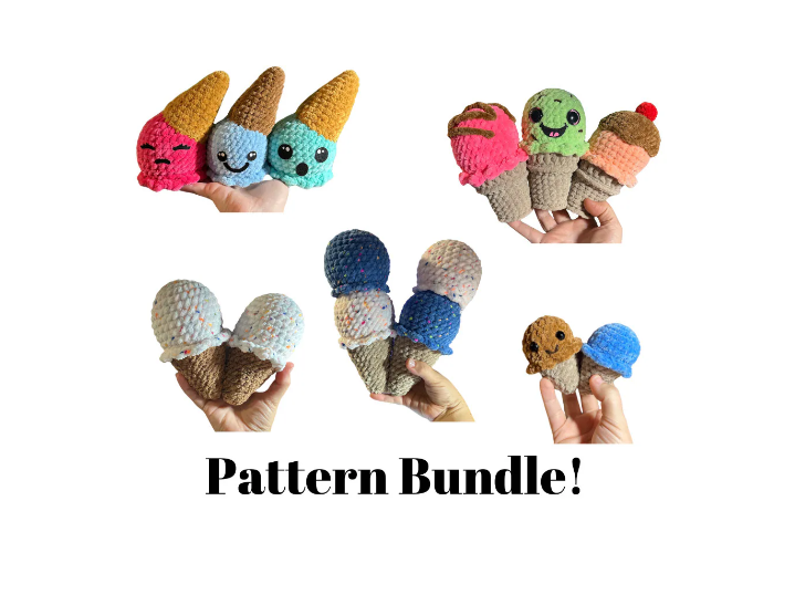 These easy-to-follow patterns will have you creating your own ice cream plushies. The photos use parfait chunky yarn as well as sweet snuggles lite and Bernat blanket yarn. Easily use a different yarn to make this item smaller or larger. I designed this pattern to be no sew! It is worked all in one piece.
