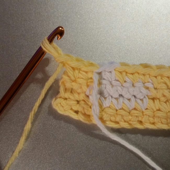 There is a picture with my yellow and white progress. Notice that you can follow along on the chart, square by square. I recommend it, over the written instructions.