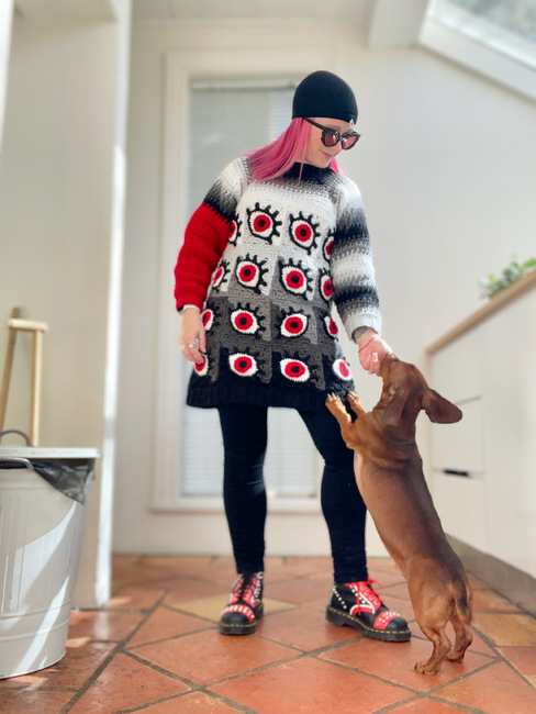 Meg and Mugwort designed the IM EYEBALLIN YOU SWEATER DRESS pattern. Find more of their patterns on their Ribblr shop page.