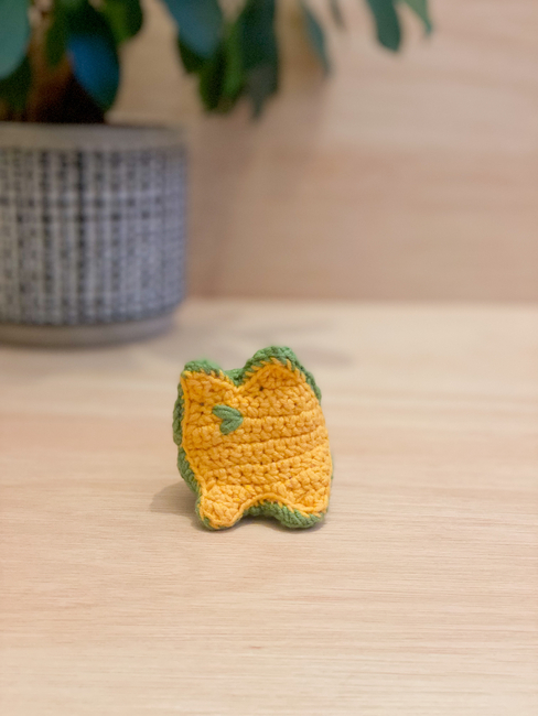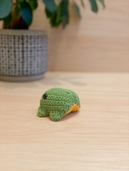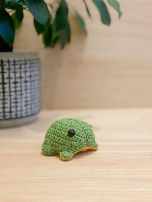 Kato-Kick designed the Joe the frog: pocket buddy pattern. Find more of their patterns on their Ribblr shop page.