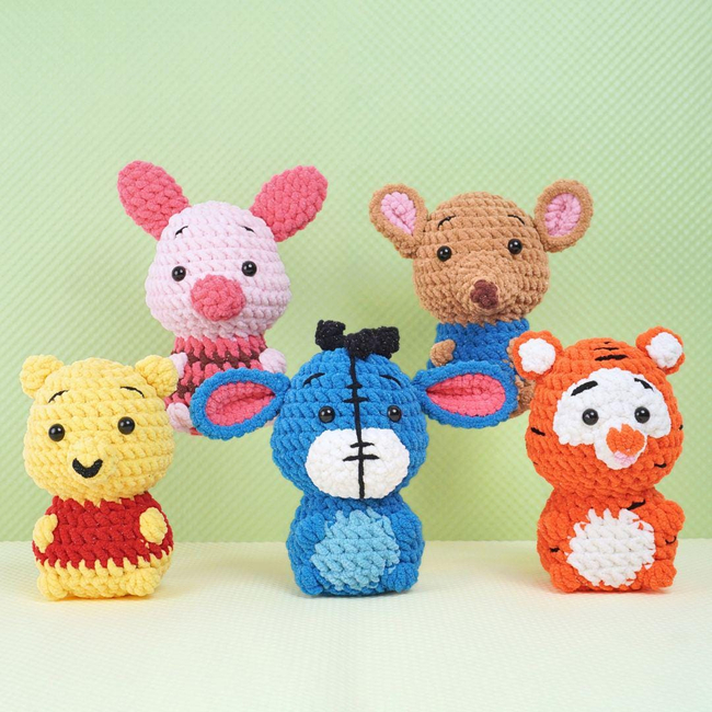 The Joyful Jungle Crew set includes five lovable charactersHoney Winnie, Buddy the Donkey, Cubby the Tiger, a pink piglet, and a brown kangaroo. Each character is meticulously detailed, featuring vibrant colors and cheerful expressions, perfect for creating a playful collection.