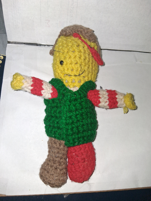To make Jr the pirate you will need: Red heart green, Red heart white, Red heart red, Red heart toffee, Red heart yellow, 1 -8mm safety eye. Tools required: 3.75mm.