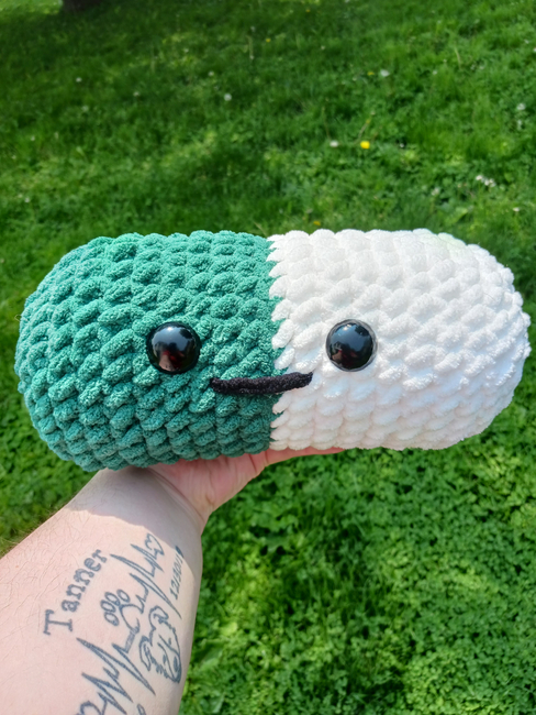 To make Jumbo Chill Pill you will need: Bernat Blanket White, Bernat Blanket Green, 24mm Safety Eyes, Stuffing. Tools required: 6.5mm.