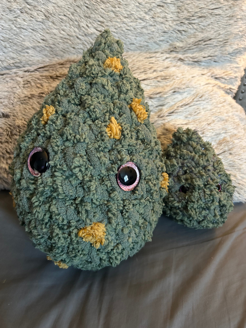 To make Jumbo Kush Buddie you will need: Bernat Blanket Extra Chunky in Smoky Green, Lion Brand Go For Fleece in Fern, Lion Brand Go For Fleece in Gold, 30mm safety eyes, Polyfil. Tools required: 18mm hook, Tapestry Needle.