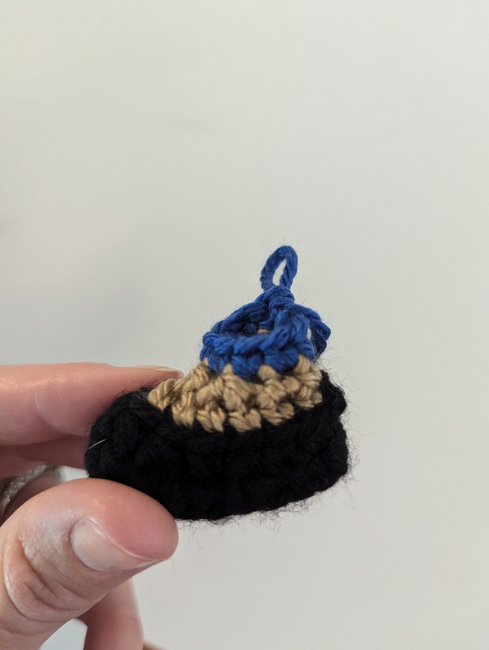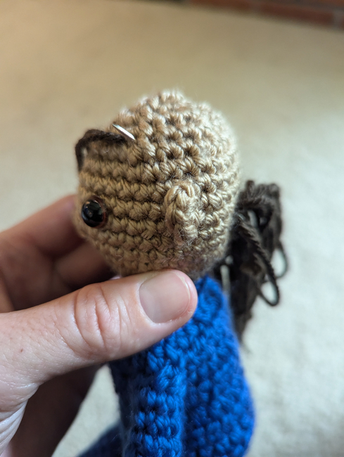 To make Kamala Harris Doll you will need: Black yarn, Lion Brand Skein Tones Hazelnut, Lion Brand Skein Tones Ebony, Lion Brand Basic Stitch anti-pilling Royal, White felt, Polyfill, Pair of brown 9mm safety eyes, 16 gauge aluminum wire, White thread, plastic white pearl beads 4mm, Red or magenta embroidery floss, Stitch marker, placed at the first stitch of every round and moved as you go. Tools required: Size E crochet hook, Tapestry needle, Wire cutter (for jewelry)and small pliers, Slicker brush, Tacky glue.