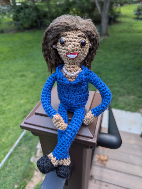 This is a crocheted Kamala Harris Amigurumi doll. Wire is inserted into the body, arms, and legs in order for them to be positioned how you like. Don't forget to add her signature pearl earrings and necklace! I am choosing royal blue for her suit color but other good choices would be tan, light blue, black, or purple.