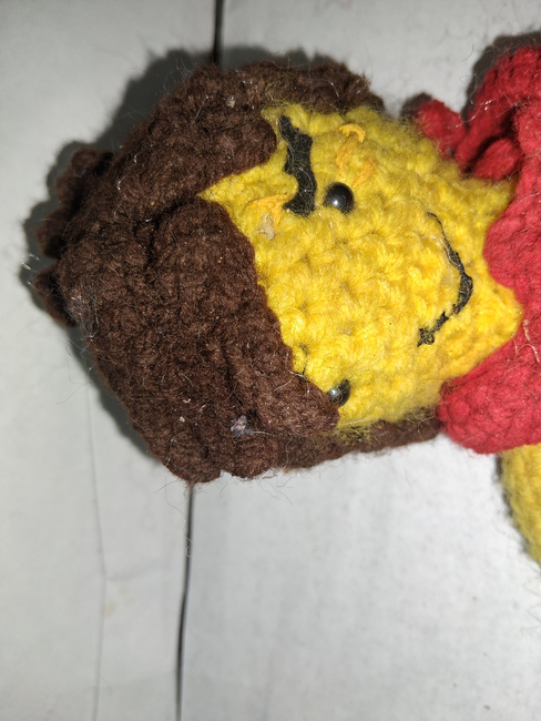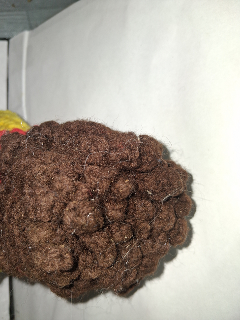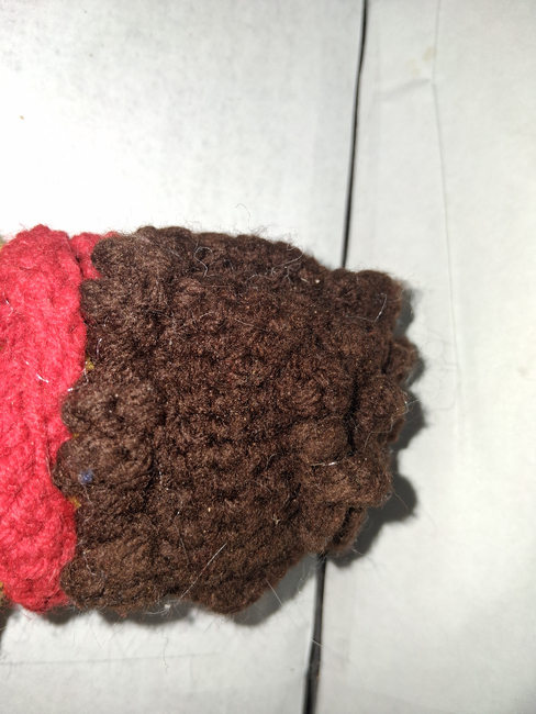 To make kenai you will need: red heart red, red heart dk brown, red heart yellow, red heart black, black felt, 8mm eyes. Tools required: 3.75mm.