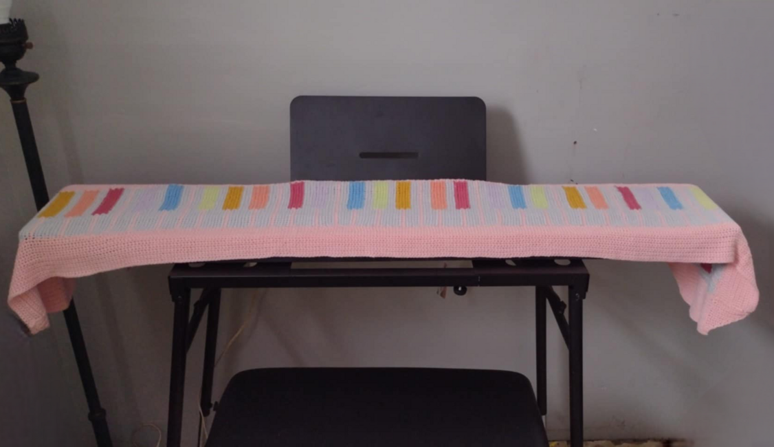 This pattern is for the keyboard keys. Add a round or two of sc and it can be a scarf. I put 3 inches around it. Imagine it as a couch cover, or a blanket.