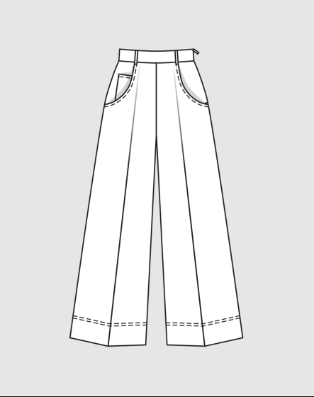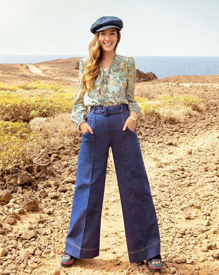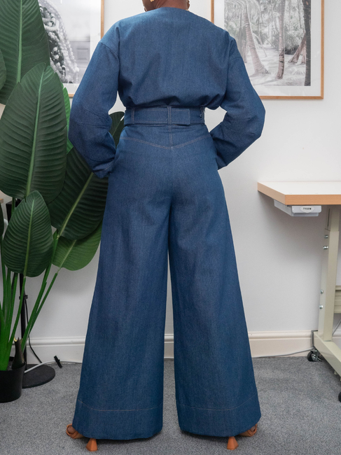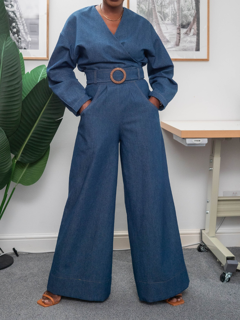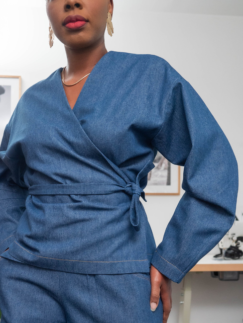 "This pattern bundle comprises four functional and stylish wardrobe essentials that form a capsule collection perfect for the season. The items can be worn together (as seen with the denim wrap top and wide-leg pants) or worn on their own. I am a huge fan of wide leg pants, and this time I chose light blue denim material to create mine. The fit and colour is very classic, something I can dress up or down depending on the occasion. Each design carries a timeless appeal that will effortlessly blend into your wardrobe."