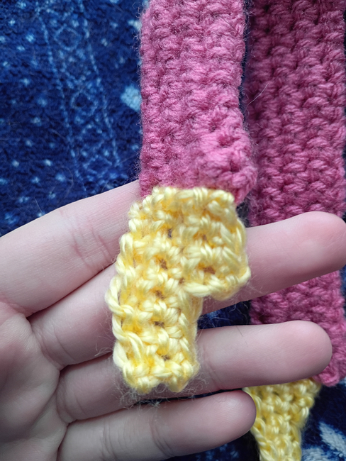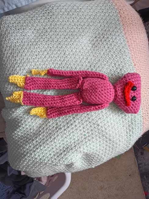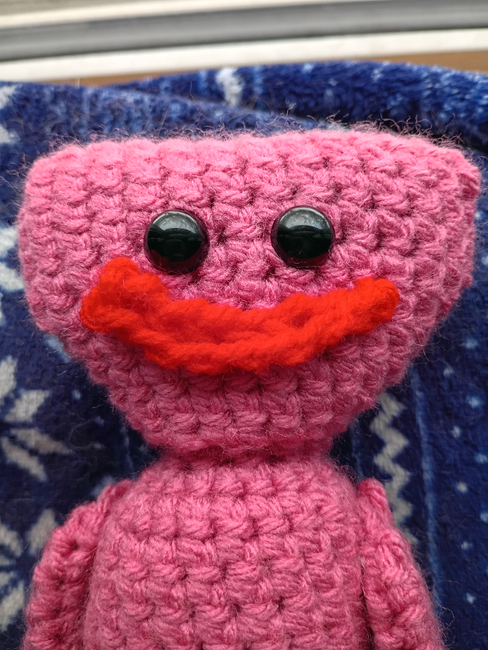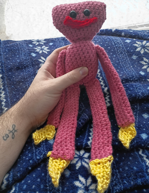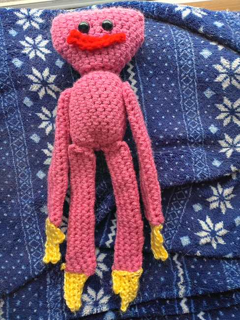 This is a pattern for a character named Kissy Missy, from a game called Poppy Playtime. It could also work for Huggy Wuggy if you change the main yarn color to blue instead of pink. The end product is about 12 inches long.