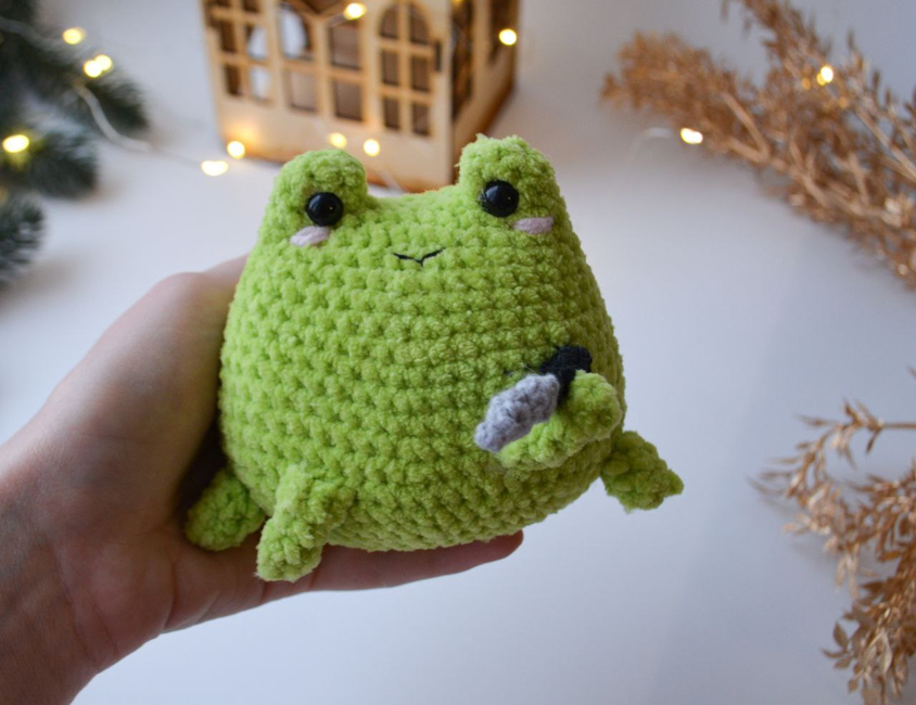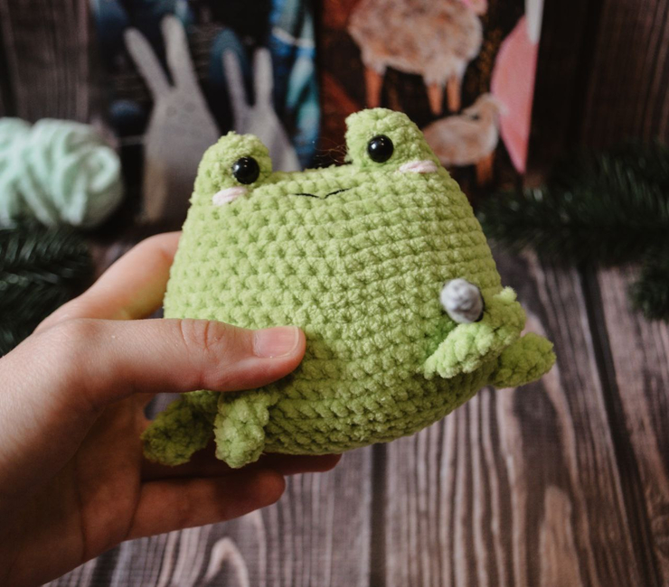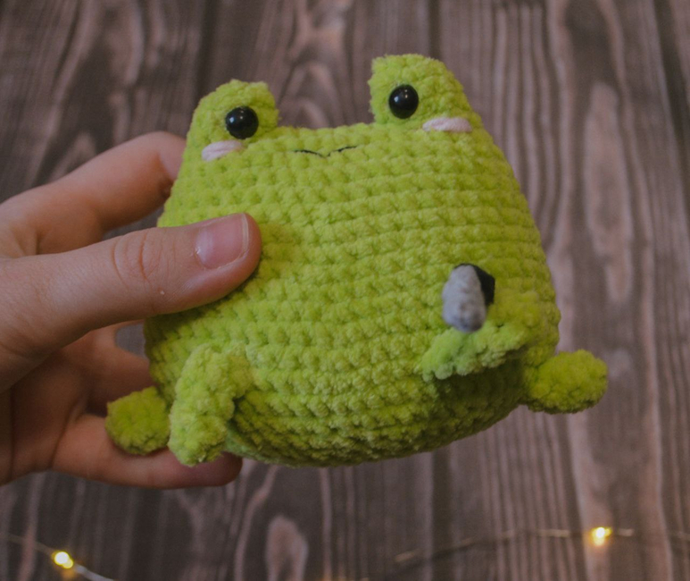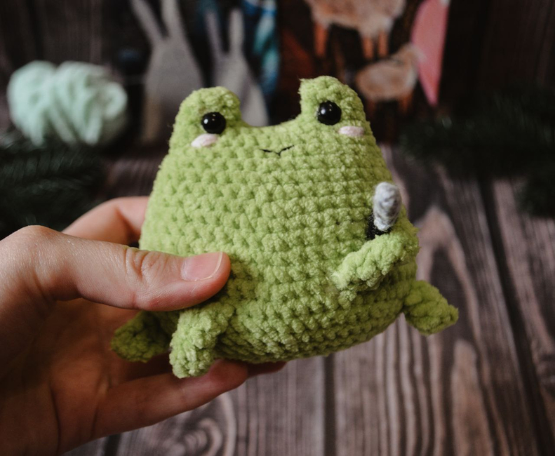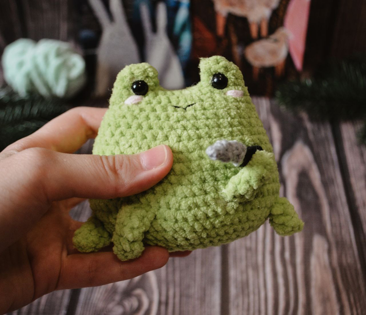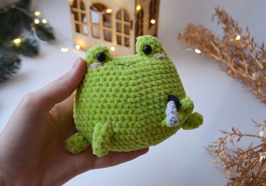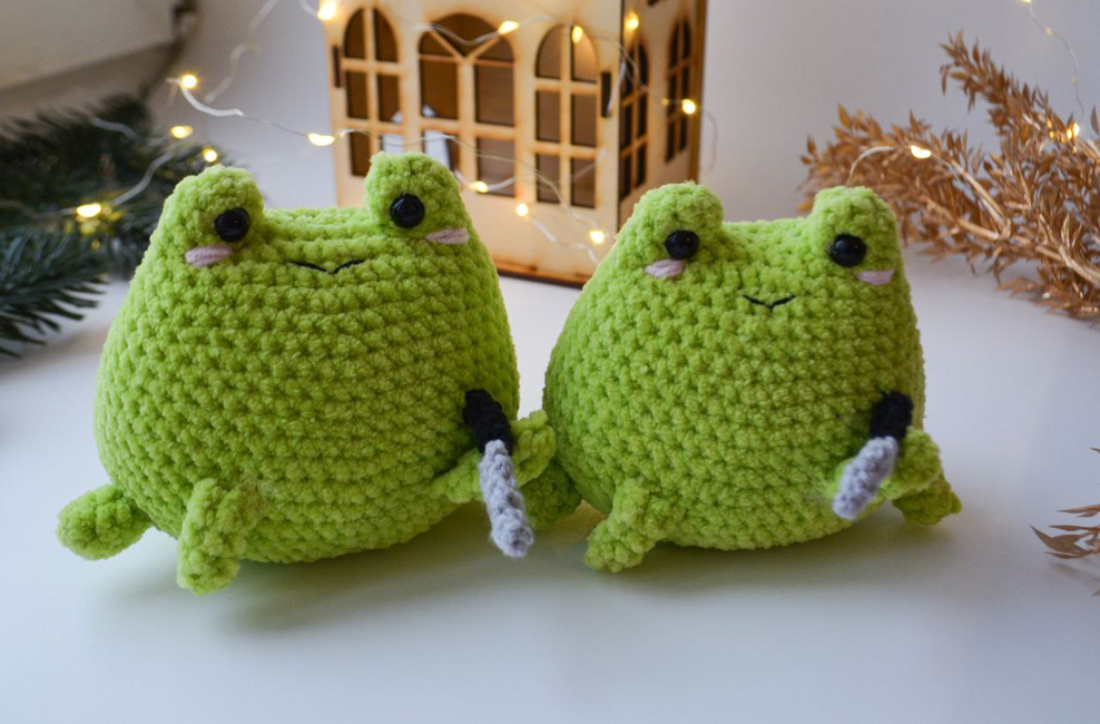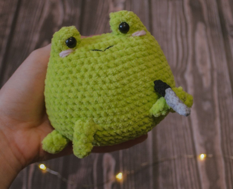 This is crochet pattern of cute Frog with knife. It contains 51 step-by-step photos.
