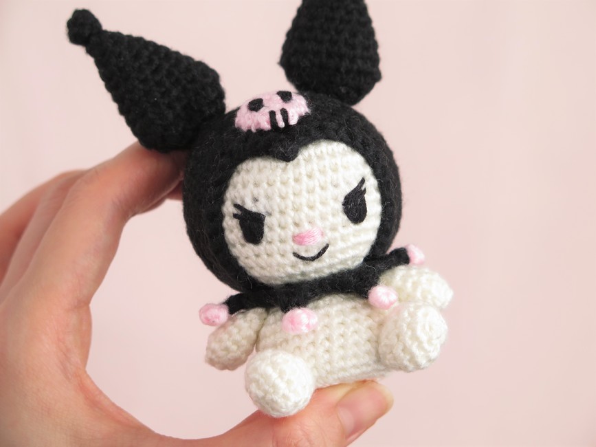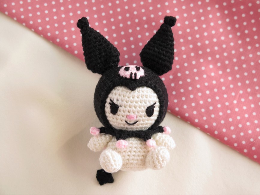 This crochet pattern contains a detailed description on how to crochet a Kuromi inspired bunny, aided by step-by-step photos.