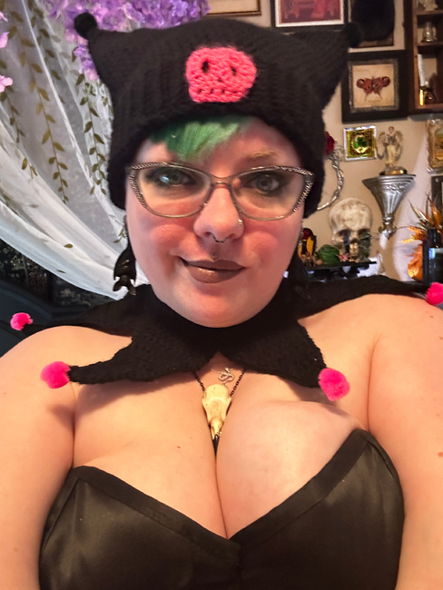 Nyx Novturnal designed the Kuromi Hat pattern. Find more of their patterns on their Ribblr shop page.