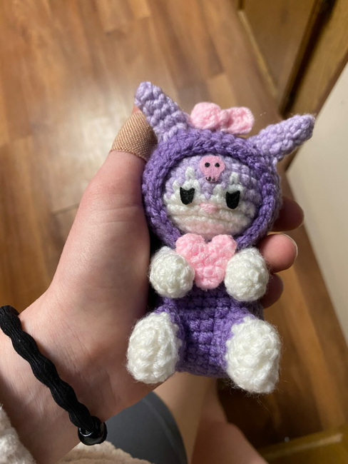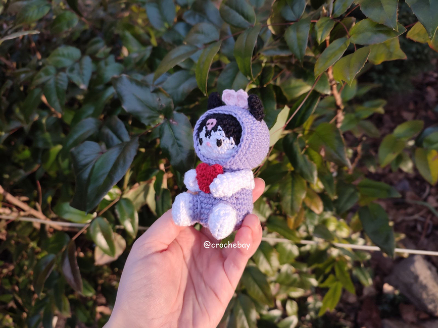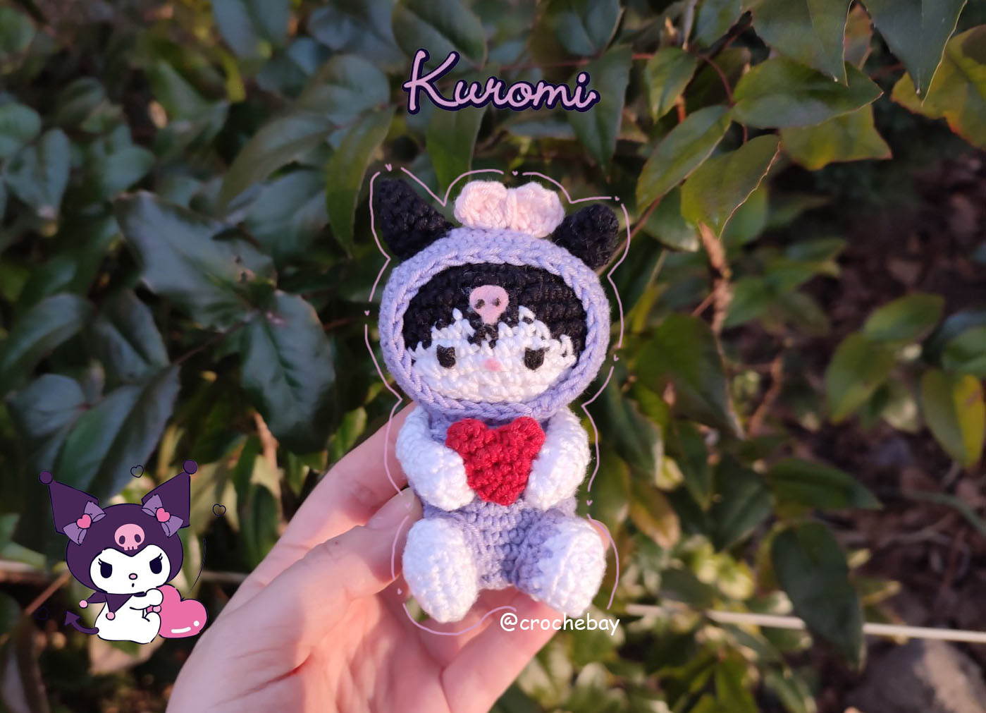 This is Kuromi the Valentine! She can be an amazing St. Valentines Day present. You can give in her hands not only the heart but also some kind of fruit or flower, or to crochet another sanrio character just by changing the face! So the pattern is adjustable :)