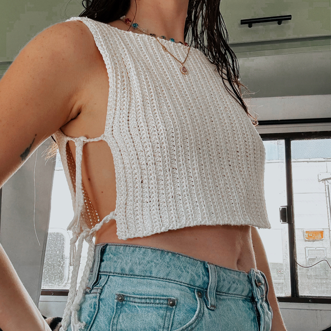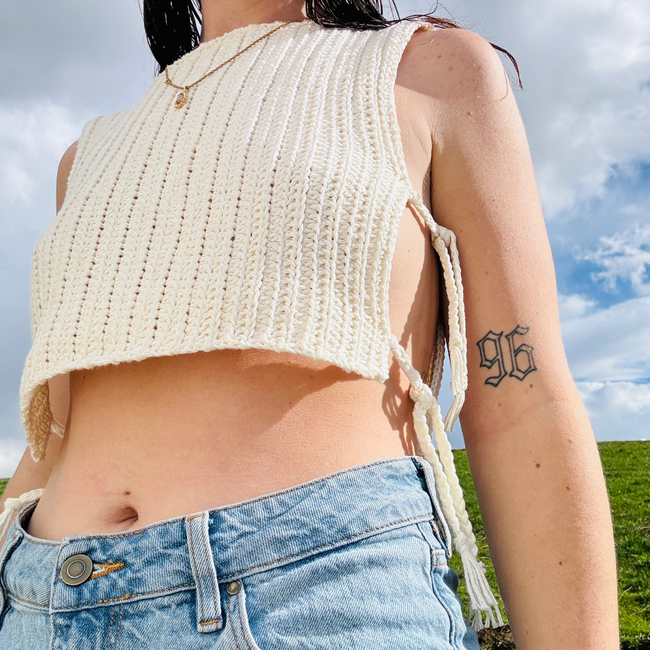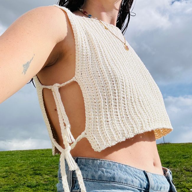 kopoi studios designed the La concha crop top crochet pattern pattern. Find more of their patterns on their Ribblr shop page.