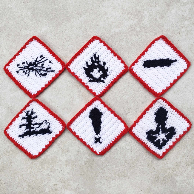 In this pattern, you will find graphs for cup coasters inspired by signs: GHS01, GHS02, GHS04, GHS07, GHS08, GHS09.