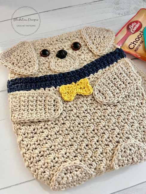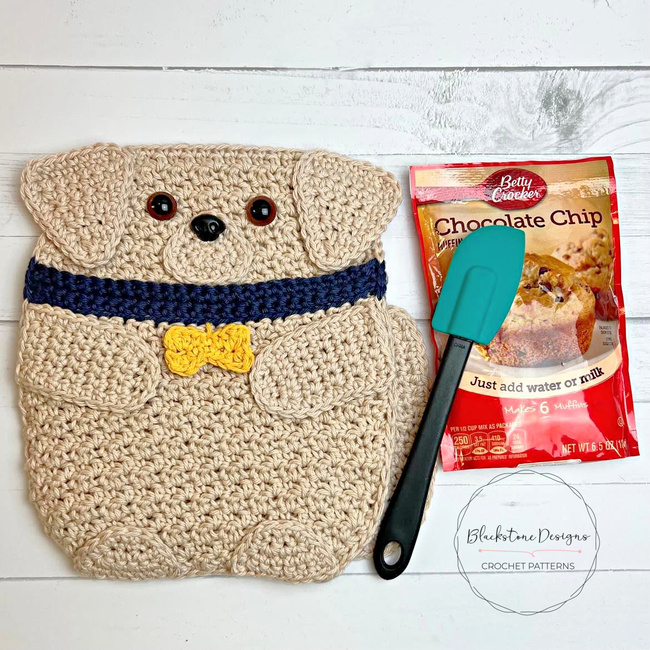 The Labrador Retriever Pot Holder is the perfect gift for dog lovers! This crochet pot holder has a pocket on the front for adding little gifts like cookie mix, spatulas, and recipe cards.