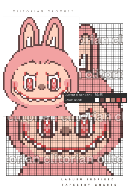 You get 6 tapestry crochet charts for the 6 adorable Labubus you've come to know and love. Dada, Zizi, Sisi, Hehe, Ququ, and Baba! Each chart will have dimensions and a color key to make things easier for you! These are charts only, no written instructions beyond a simple explanation of how you can create them. If you want, you can also purchase my tapestry charts on my ko-fi shop: