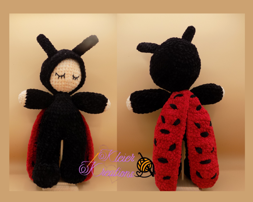 This ladybug baby doll is for early intermediate crocheters. You will be crocheting arms, legs, & antenna on as you go. The hood, ears, wings & facial features will be sewn on. This pattern is an original of mine. It is for personal use only. Do not copy or sell the pattern. You are welcome to sell your finished product, but please give me pattern credit when posting online.