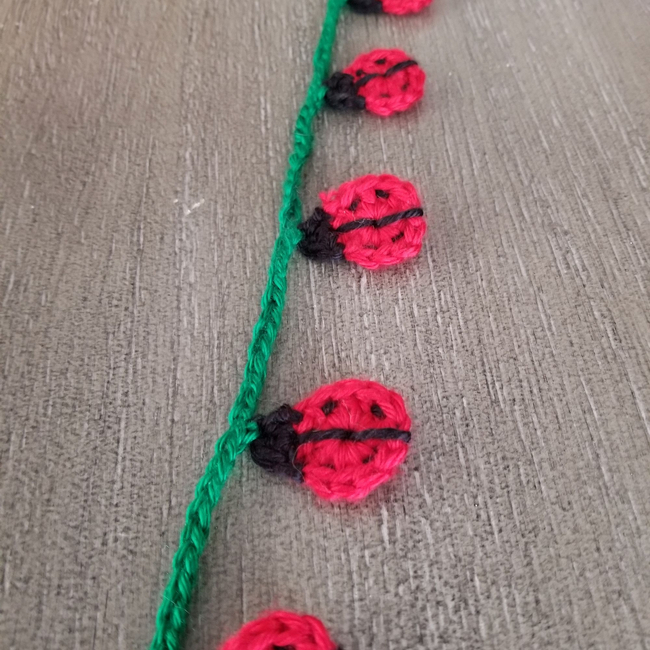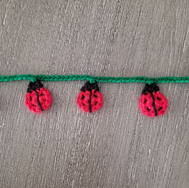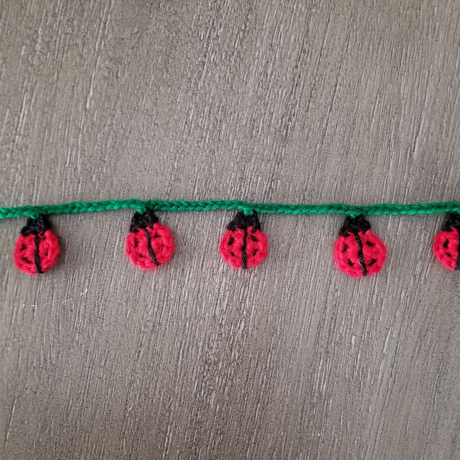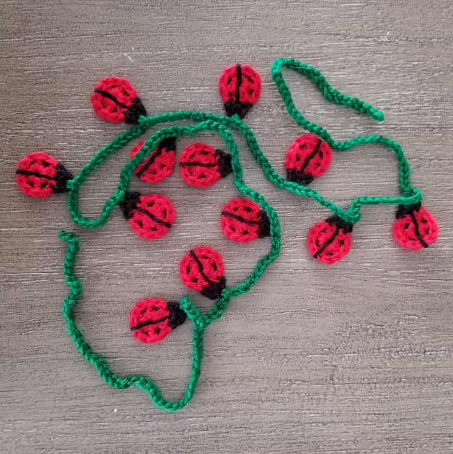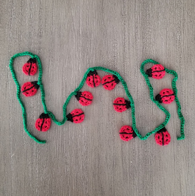 Finished garland measures 53 inches, ladybugs are 1 1/2 inches x 2 inches.