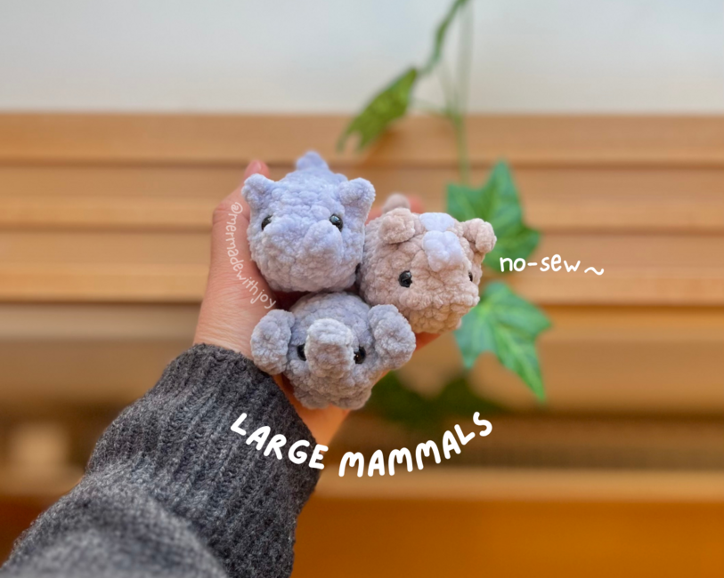 To make Large Mammals - 3-in-1 No-Sew Mini Loaf Animals Pattern Bundle you will need: elephant; but this could be use for all three!, rhino, hippo, rhino horns. Tools required: 4.0 mm, - scissors - yarn needle- stitch marker- 8 mm safety eyes - stuffing.